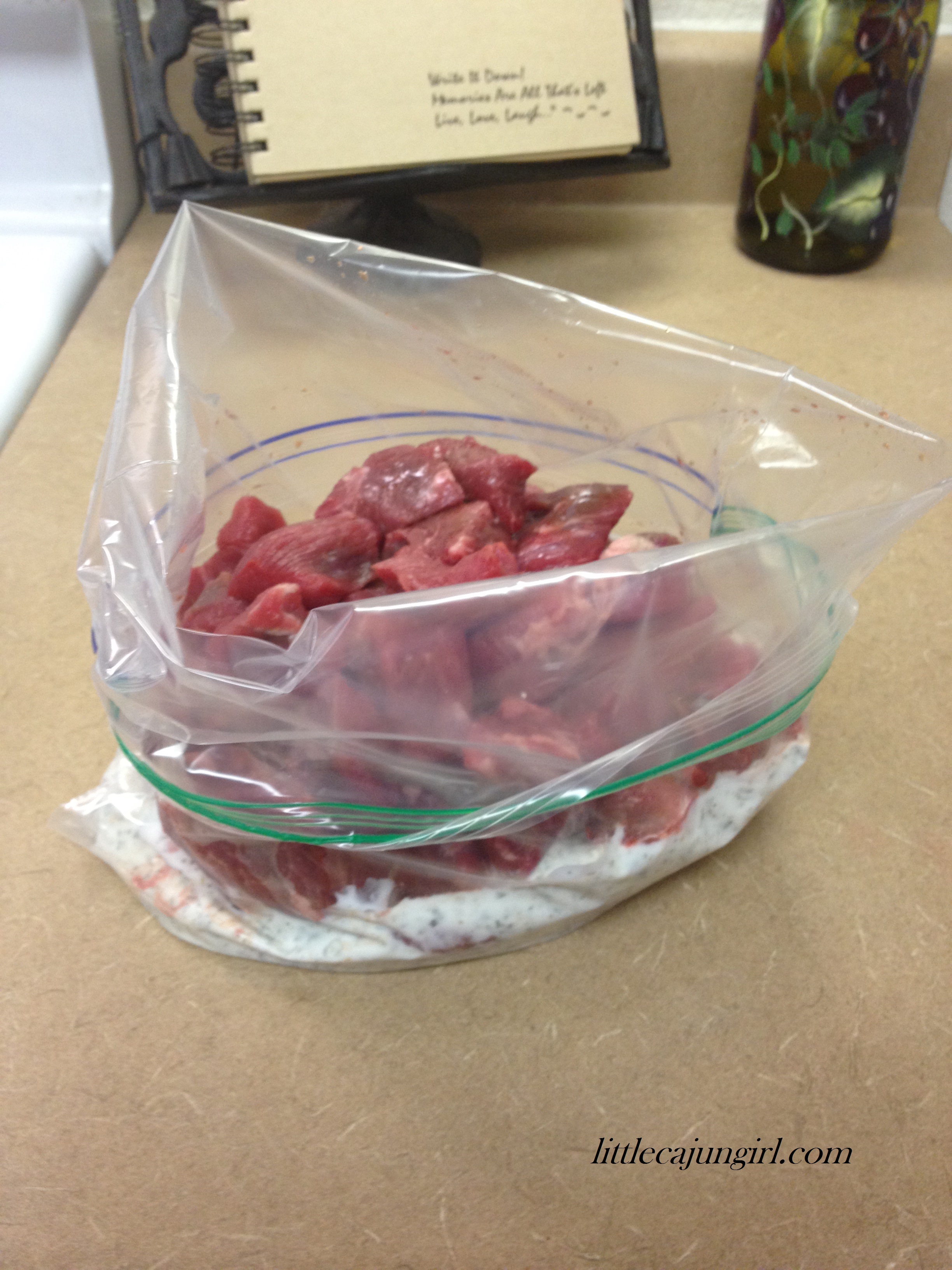 Ingredients: beef meat for stew (any type you like, cubed); plain, non-fat Greek yogurt; lemon juice; minced garlic; dried parsley; dried oregano; salt.